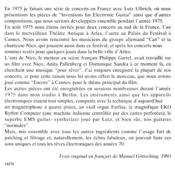 Liner Notes: Texte original en français de [Original text in French by Manuel Göttsching. 1993