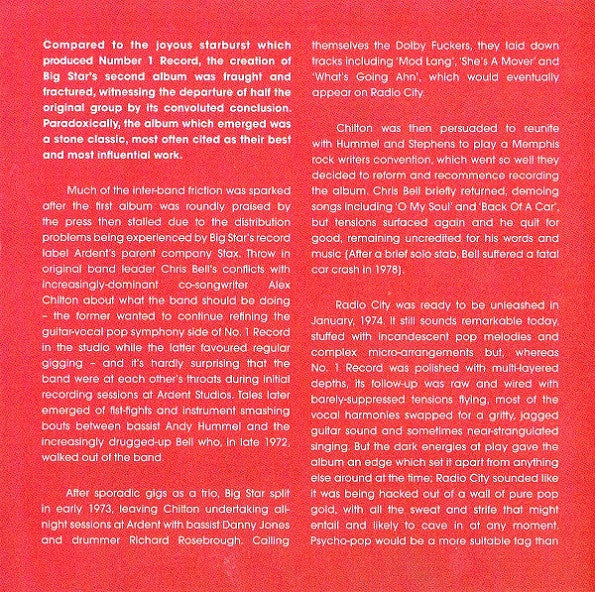 "All tracks written by Chilton except 2, 4 & 8 (7) written by Chilton-Hummel, track 16 (3) written by Hummel, track 19 (6) written by Chilton-Rosebrough, and track 21 (8) written by Chilton-Hummel-Stephens." - The booklet mixed up the track credits; the correct track numbers are given here in brackets.