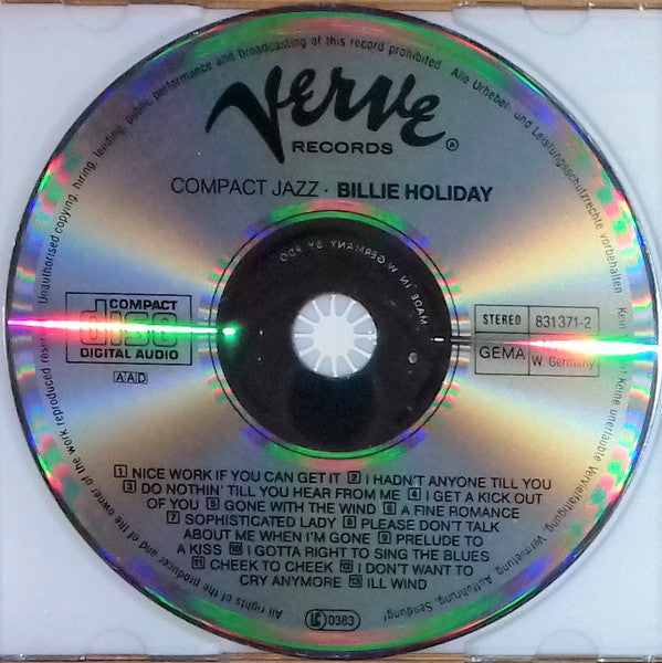 Disc print, rear cover and insert rear differ from "Billie Holiday". This version has rights society GEMA printed on disc and has "MADE IN WEST-GERMANY · PRINTED IN WEST-GERMANY" on rear cover and insert rear.