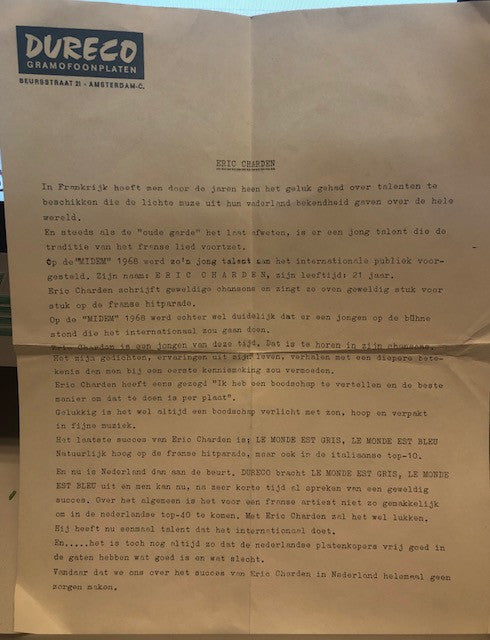 Eric Charden - Le Monde Est Gris, Le Monde Est Bleu (7", Single, Promo)
