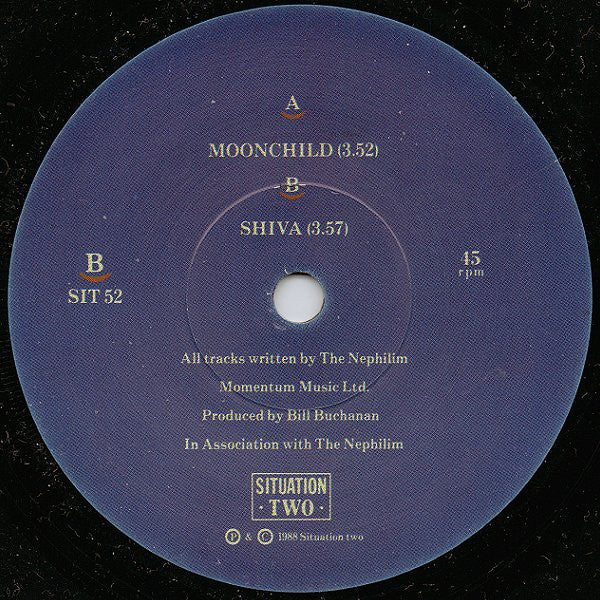 Release note: The A-side is titled 'Moonchild' on the label, and 'Moonchild (First Seal)' on the sleeve. Label notes: Made in England. ℗ & © 1988 Situation Two Sleeve notes: Sleeve creation by "Sheer Faith" Info, 24 Gaskin St. Islington, London N1. Longevity to our machine brain "A vague guest on a darkened Earth"