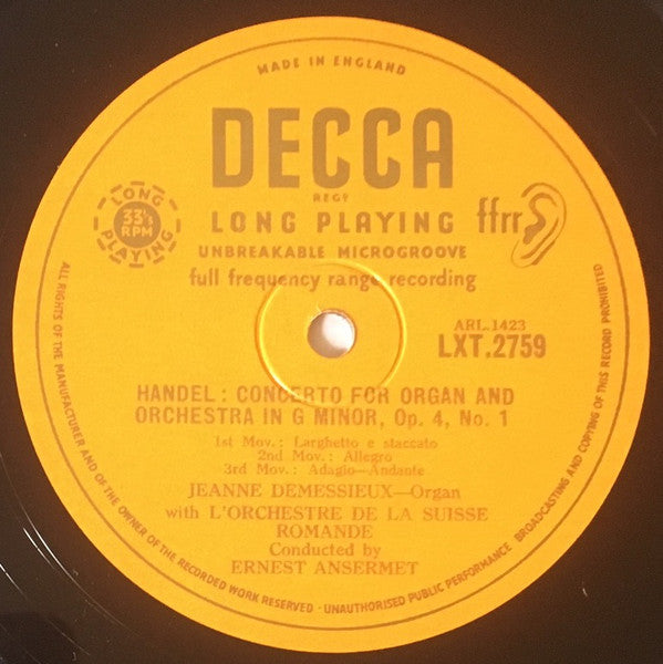 Georg Friedrich Händel, Jeanne Demessieux, Ernest Ansermet Conducting L'Orchestre De La Suisse Romande - Organ Concertos, Op. 4, Nos. 1 & 2 (LP, Mono)