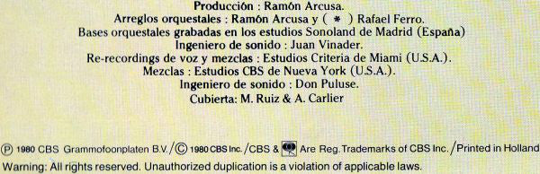 Bases orquestales grabadas en los estudios Sonoland de Madrid (España). Re-recordings de voz y mezclas: Estudios Criteria de Miami (U.S.A.). Mezclas: Estudios CBS de Nueva York (U.S.A.). ℗ 1980 CBS Grammofoonplaten B.V. / © 1980 CBS Inc. Made in Holland Packaged in a gatefold sleeve.