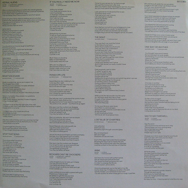 Contains seperate sheet with lyrics on one side and color pictures on the other side (including credit for innersleeve photography by Peter Scherpenzeel).