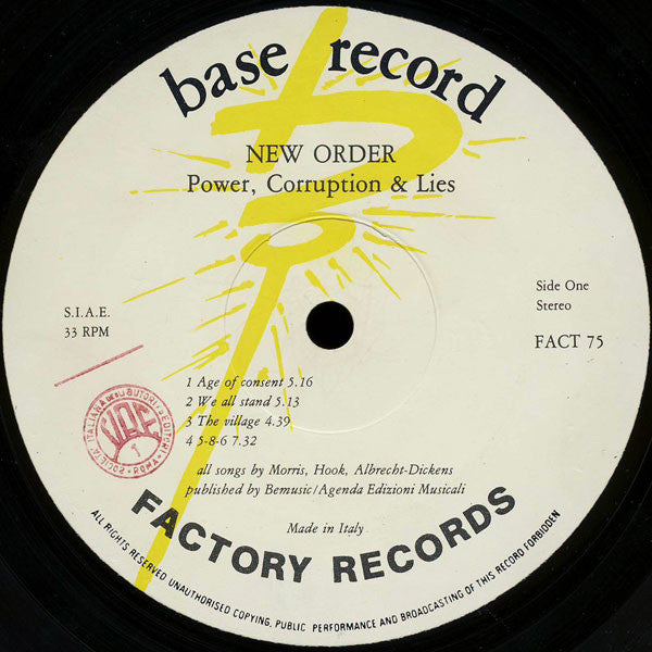 Issued on Base Record labels with Factory Records printed at bottom. Issued in sleeve with die-cut back cover. Catalog number FACT 75 on labels. Catalogue number FACT SEVENTY FIVE on spine. All songs published by Bemusic/Agenda Edizioni Musicali Made in Italy by Base Record Bologna. Roses: Reproduced By Courtesy of the Trustees, The National Gallery, London.