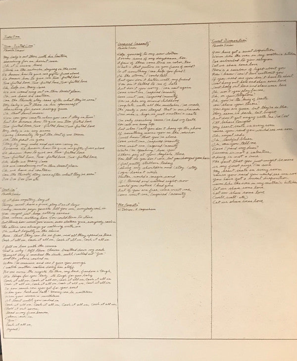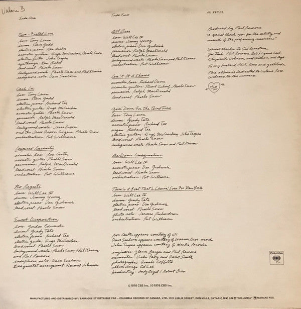 Issued with a printed 2-sided lyrics sheet. Printed on back cover: "a special thank you for the artistry and warmth of the performing musicians." Special thanks to Sid Bernstein, Joe Toub, Phil Ramone, Bob & Lynne Laub, Elizabeth Johnson, and William and Aya. To my husband, Phil, love and gratitude. This album is dedicated to Valerie Rose. Welcome to the universe. P.P. Loves D.A. Ron Carter appears courtesy of CTI Dave Sanborn appears courtesy of Warner Bros. Records John Tropea appears courtesy of MArlin Records ©1976 CBS Inc./℗1976 CBS Inc. Manufactured and distributed by/Fabrique et distribue par - Columbia Records of Canada, Ltd. Printed on spine: Columbia Stereo Printed on labels: Stereo ℗1976 CBS Inc. Manufactured by Columbia Records of Canada, Ltd. Printed on lyrics sheet insert: All selections except [B5, A4, and B3 ©1975 Cosmo Music Co. (ASCAP) - A1 titled Two-Fisted Love on back cover and insert vs. Two Fisted Love on label