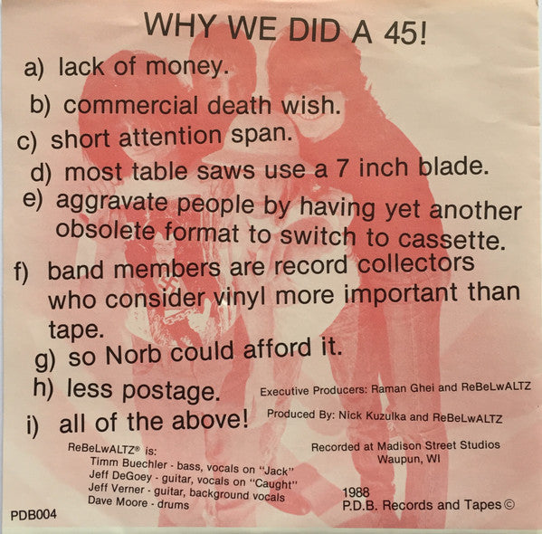 Band name is capitalized as 'ReBeLwALTz.' Comes in a fold-out sleeve in a stickered bag. 1988 P.D.B. Records and Tapes© A - Beex Music BMI B - Archie's Tazmanian Music BMI