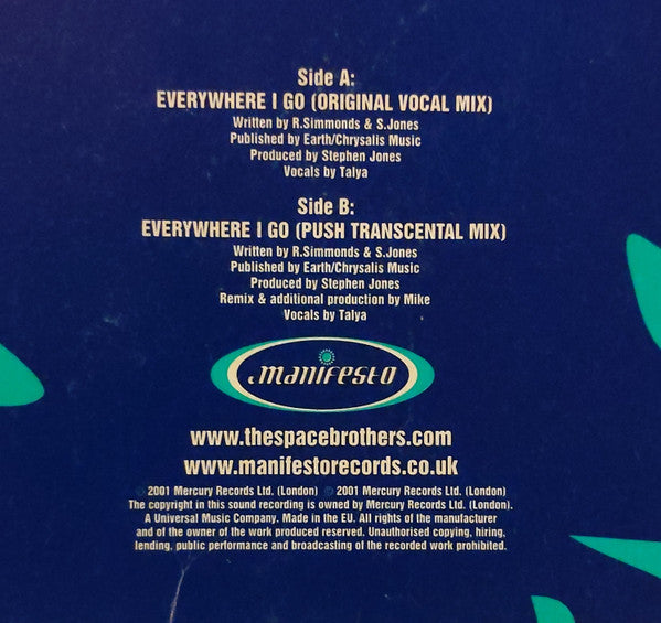 Published by Earth/Chrysalis Music ℗ 2001 Mercury Records Ltd. (London) © 2001 Mercury Records Ltd. (London) The copyright in this sound recording is owned by Mercury Records Ltd. (London). A Universal Music Company. Made in the EU. www.thespacebrothers.com www.manifestorecords.co.uk This was released in 2 parts. Vinyl 2 is here. All matrix / runout information is etched with scratched out parts on both sides.