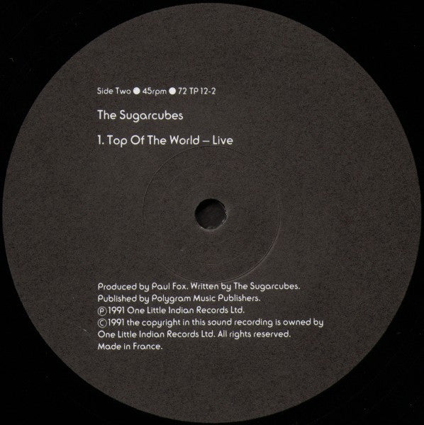 Sleeve reads: ℗&© 1992 One Little Records Ltd. Artwork © 1992 Me Company. Made in England. Record's label reads: ℗© 1991 One Little Indian Records Ltd. Made in France. Tracks are listed on sleeve as 1, 2, 3. Track 1 (A1): Assisted by Scott Blackland. Mixed at Summa Studios, Los Angeles. Track 2 (A2): Assisted by Chris Laidlow in Bearsville & Scott Blackland in Los Angeles. Track 3 (B1): Mixed by Paul & Ed with The Sugarcubes. Recorded at Bearsville N.Y. Additional recording & mixing done at Summa Studios, Los Angeles. The record's label for track 3 (B) incorrectly reads written by The Sugarcubes, however this song was written by John Bettis & Richard Carpenter.