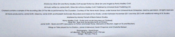 Issued in a clear PVC wallet and plain white die-cut gatefold sleeve containing: the vinyl packaged in a white inner sleeve with credits printed on it, the CD packaged in a white die-cut cardboard sleeve and an LP-size 24 page booklet with lyrics and artworks. Sticker on outer PVC wallet. Track A2 and CD2 (Chained) contains a sample of the recording 'Lilies Of The Nile' as performed by 'The Crusaders'. Courtesy of The Verve Music Group, under license from Universal Music Enterprises. Recorded and mixed at Our Studio, London between November 2011 and May 2012 with additional mixing at XL Studios. ℗ 2012 Young Turks. © 2012 Young Turks.