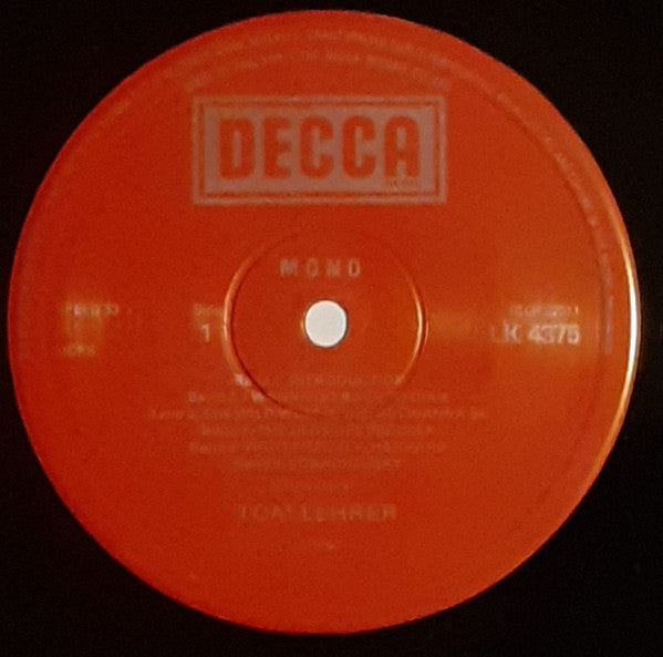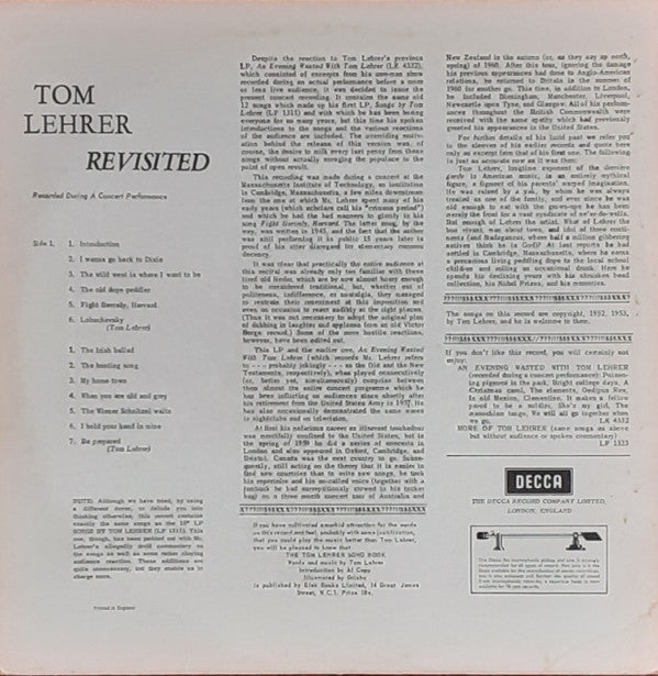 "Note: Although we have tried, by using a different cover, to delude you into thinking otherwise, this record contains exactly the same songs as the LP Songs by Tom Lehrer (LF 1311). This one, though, has been padded out with Mr. Lehrer's allegedly droll commentary on the songs as well as some rather cloying audience reaction. These additions are quite unnecessary, but they enable us to charge more."