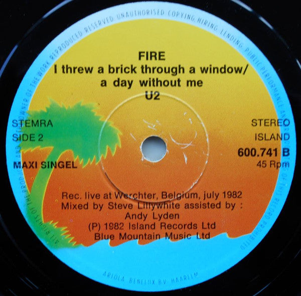 Same sleeve and catalog number as another Dutch release, but with different labels (45 Rpm on the right hand side and 'Maxi Singel' on the left hand side). B1 & B2 recorded live at Werchter, Belgium, July 1982. (P) 1982 Island Records Ltd. Some copies may have a rectangular white sticker pasted over the original cat# on rear sleeve, upper right corner, displaying the cat# 850 027-213 in black lettering.