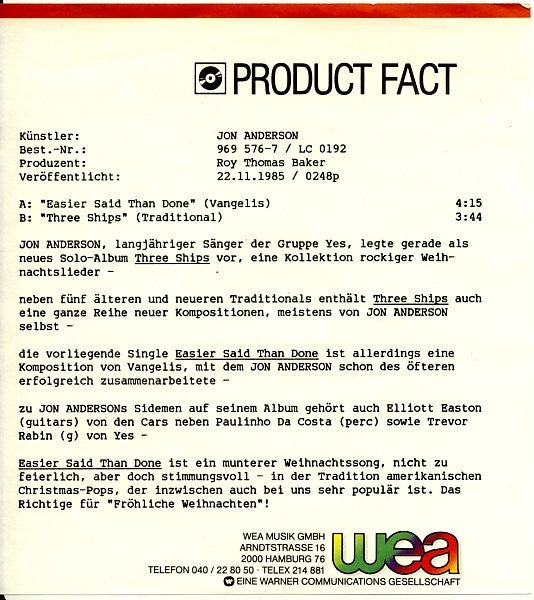 Jon Anderson - Easier Said Than Done / Three Ships (7", Single)