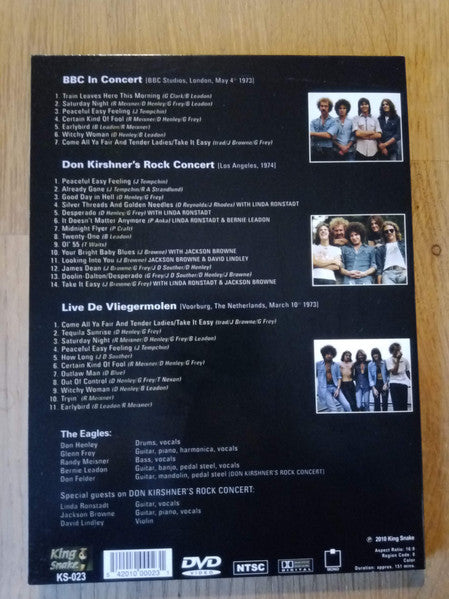 . BBC In Consert 1. Train Leaves Here This Morning 2. Saturday Night 3. Peaceful Easy Feeling 4. Certain Kind Of Fool 5. Earlybird 6. Witchy Woman 7. Come All Ya Fair And Tender Ladies / Take It Easy . Don Kirshner's Rock Concert 1. Peaceful Easy Feeling 2. Already Gone 3. Good Day In Hell 4. Silver Threads And Golden Needles 5. Desperado 6. It Doesn't Matter Anymore 7. Midnight Flyer 8. Twenty-One 9. Ol' 55 10. Your Bright Baby Blues 11. Looking Into You 12. James Dean 13. Doolin - Dalton / Desperado 14. Take It Easy . Live De Vliegermolen 1. Come All Ya Fair And Tender Ladies / Take It Easy 2. Tequila Sunrise 3. Saturday Night 4. Peaceful Easy Feeling 5. How Long 6. Certain Kind Of Fool 7. Outlaw Man 8. Out Of Control 9. Witchy Woman 10. Tryin' 11. Earlybird