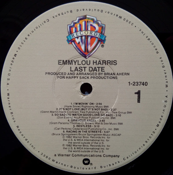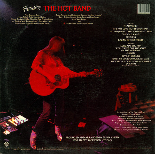 Catalog number on labels: 1-23740 Catalog number on spine and inner sleeve: 9 23740-1 Issued with a printed inner-sleeve. Recorded live by The Enactron Truck. Mixed at Magnolia Sound Studios, North Hollywood. Produced for Happy Sack Productions. The copyright and contact info on the back of the jacket (including the "a Warner Communications Company" notice) is split in half between Harris' shoe.