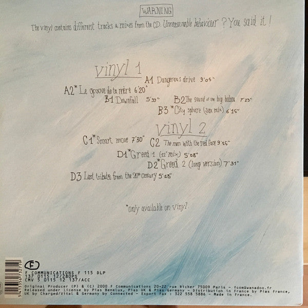 Written & produced at the Wake Up Lab around Paris Published by Basic Groove Publishing Cutting by The Exchange Original producer (P) & (C) 2000 F Communications Released under license by Pias Benelux, Pias UK & Pias Germany Distribution in France by Pias France, UK by Charged/Vital & Germany by Connected Made in France Cat#s on the back of the sleeve: F 115 DLP 137 0115 12/280PS CMV 5 0115 12 137/ACC Cat# on the spine of the sleeve and the centre labels: 137 0115 12 Comes in a gatefold sleeve. Contains different tracks and mixes compared to the CD version of the album. Sleeve erroneously lists the credits of track D3 on track D2.