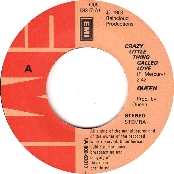 side A: ℗ 1969 Raincloud Productions side B: ℗ 1979 Raincloud Productions Stereo. B-side taken from the album 'Queen - Live Killers' Therefore track B is a live version. This version has a misprint on the label of side A, which falsely states the track is from 1969. Although this version is the misprinted one, it is much more common than the one with the correct label, which states 1979.