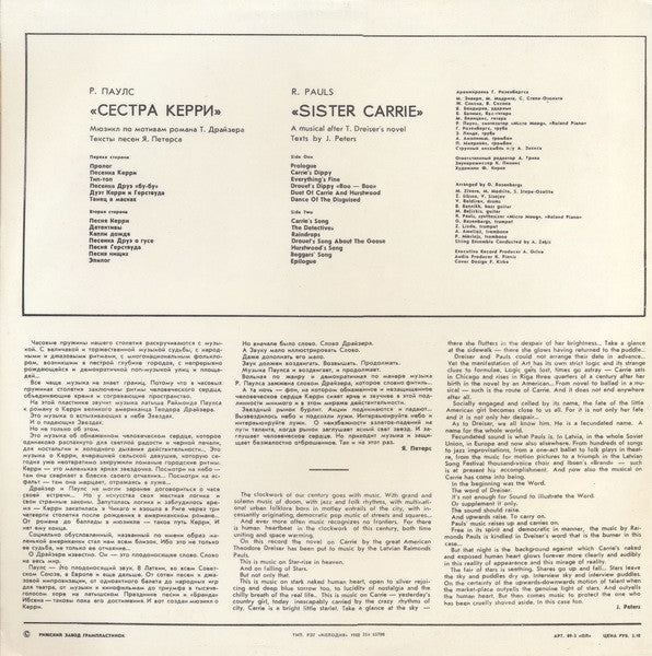 Raimonds Pauls, Jānis Peters - Сестра Керри (LP, Album, RP, Whi)
