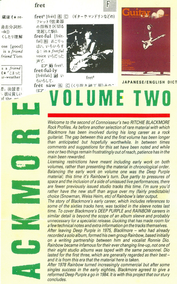 Tracks 1 and 2 credited to Blackmore Orchestra; A and B-Side single Oriole CB-314 (1965); tracks 3 and 4 A and B-Side Screaming Lord Sutch single CBS 201767 (1965); track 5 previously unreleased; track 6 released on MCA Records MKPS 2021 (1971); tracks 7 and 8 from Lord Sutch And Heavy Friends - Hands Of Jack The Ripper Atlantic K40313 (1972); track 9 A-side Atlantic single ATL 10 290 (1973); track 10 from Ritchie Blackmore's Rainbow (1975); tracks 11 and 13 previously unreleased (at the time) live versions recorded at Sporthalle Cologne Germany 25 September 1976 and Circus Krone Munich Germany 29 September 1976; track 12 from Long Live Rock N Roll 1978; track 14 from Humanesque RCA Victor 5004 (1980); track 15 (misspelled Alerick on insert) from B-side Knocking At Your Back Door single (1984).