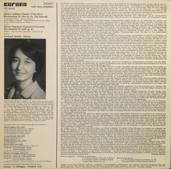 Jan Ladislav Dusík / Johann Nepomuk Hummel, Sontraud Speidel - Klaviersonate Op. 44 / Klaviersonate Op. 81 (LP, Album)