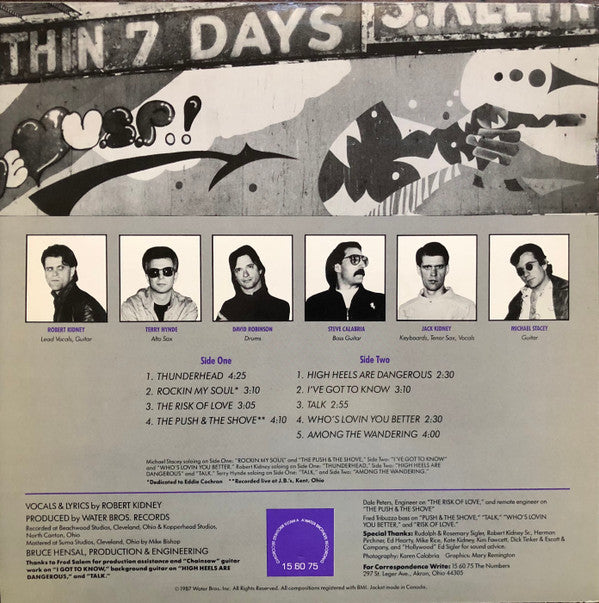 A1. Thunderhead 4:25 A2. Rockin My Soul 3:10 A3. The Risk Of Love 3:05 A4. The Push & The Shove 4:10 B1. High Heels Are Dangerous 2:30 B2. I've Got To Know 3:10 B3. Talk 2:55 B4. Who's Lovin You Better 2:30 B5. Among The Wandering 4:00