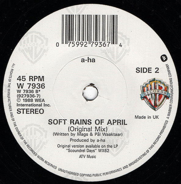 Matte paper picture sleeve with long thumb cut top opening Runouts are etched B: Original version available on the LP "Scoundrel Days" WX62 ATV Music. ℗ 1988 WEA International Inc. © 1988 WEA Records Ltd. Distributed by WEA Records Ltd. A Warner Communications Co. Made in UK 1st & 2nd cat# printed on labels 3rd & 4th cat# printed on sleeve