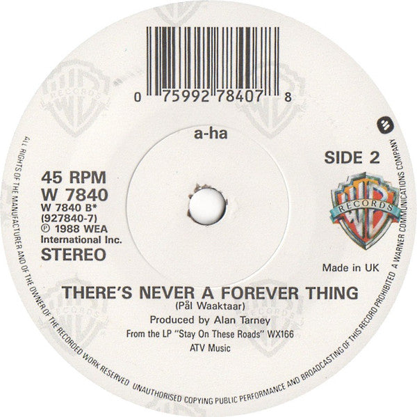 Paper label variant with barcode - different to [r=6854359. Taken from the album "Stay On These Roads" WX166 ATV Music. ℗ 1988 WEA International Inc. © 1988 WEA Records Ltd. Distributed by WEA Records Ltd. A Warner Communications Co. Made in UK Runouts are etched