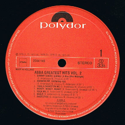 A1. Gimme! Gimme! Gimme! (A Man After Midnight) 4:45 A2. Knowing Me, Knowing You 4:02 A3. Take A Chance On Me 4:05 A4. Money, Money, Money 3:05 A5. Rock Me 3:03 A6. Eagle 5:51 A7. Angeleyes 4:20 B1. Dancing Queen 3:50 B2. Does Your Mother Know 3:13 B3. Chiquitita 5:26 B4. Summer Night City 3:34 B5. I Wonder (Departure) 4:38 B6. The Name Of The Game 4:54 B7. Thank You For The Music 3:48
