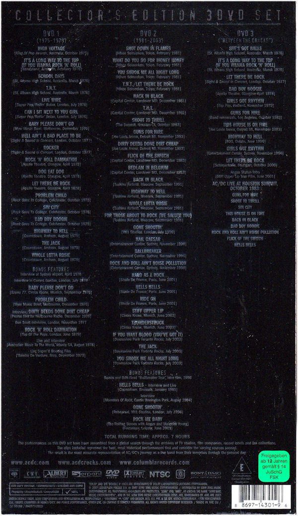 . DVD 1 (1975-1979) 1-1. High Voltage (King Of Pop Awards, Australia, October 1975) 1-2. It's A Long Way To The Top (If You Wanna Rock 'N' Roll) (Bandstand, Australia, February 1976) 1-3. School Days (St. Albans High School, Australia, March 1976) 1-4. T.N.T. (St. Albans High School, Australia, March 1976) 1-5. Live Wire (Super Pop/Rollin' Bolan, London, July 1976) 1-6. Can I Sit Next To You Girl (Super Pop/Rollin' Bolan, London, July 1976) 1-7. Baby Please Don't Go (Myer Music Bowl, Melbourne, December 1976) 1-8. Hell Ain't A Bad Place To Be (Sight & Sound In Concert, London, October 1977) 1-9. Rocker (Sight & Sound In Concert, London, October 1977) 1-10. Rock 'N' Roll Damnation (Apollo Theatre, Glasgow, April 1978) 1-11. Dog Eat Dog (Apollo Theatre, Glasgow, April 1978) 1-12. Let There Be Rock (Apollo Theatre, Glasgow, April 1978) 1-13. Problem Child (Rock Goes To College, Colchester, October 1978) 1-14. Sin City (Rock Goes To College, Colchester, October 1978) 1-15. Bad Boy Boogie (Rock Goes To College, Colchester, October 1978) 1-16. Highway To Hell (Countdown, Arnhem, August 1979) 1-17. The Jack (Countdown, Arnhem, August 1979) 1-18. Whole Lotta Rosie (Countdown, Arnhem, August 1979) . Bonus Features 1-19. Interview At Sydney Airport, April 1976 1-20. Interview In Covent Garden, London, July 1976 1-21. Baby Please Don't Go (Szene 77, Circus Krone, Munich, September 1976) 1-22. Problem Child (Myer Music Bowl, Melbourne, December 1976) 1-23. Interview/Dirty Deeds Done Dirt Cheap (Promo Film For Melbourne Radio, December 1976) 1-24. Bon Scott Interview, London, November 1977 1-25. Rock 'N' Roll Damnation (Top Of The Pops, London, June 1978) 1-26. Live And Interview (Australian Music To The World, Atlanta GA, August 1978) 1-27. Live Super 8 Bootleg Film (Théatre De Verdure, Nice, December 1979) . DVD 2 (1981-2003) 2-1. Shot Down In Flames (Nihon Seinenkan, Tokyo, February 1981) 2-2. What Do You Do For Money Honey (Nihon Seinenkan, Tokyo, February 1981) 2-3. You Shook Me All Night Long (Nihon Seinenkan, Tokyo, February 1981) 2-4. T.N.T./Let There Be Rock (Nihon Seinenkan, Tokyo, February 198) 2-5. Back In Black (Capital Center, Landover MD, December 1981) 2-6. T.N.T. (Capital Center, Landover MD, December 1981) 2-7. Shoot To Thrill (The Summit, Houston TX, October 1983) 2-8. Guns For Hire (Joe Louis Arena, Detroit MI, November 1983) 2-9. Dirty Deeds Done Dirt Cheap (Joe Louis Arena, Detroit MI, November 1983) 2-10. Flick Of The Switch (Capital Center, Landover MD, December 1983) 2-11. Bedlam In Belgium (Capital Center, Landover MD, December 1983) 2-12. Back In Black (Tushino Airfield, Moscow, September 1991) 2-13. Highway To Hell (Tushino Airfield, Moscow, September 1991) 2-14. Whole Lotta Rosie (Tushino Airfield, Moscow, September 1991) 2-15. For Those About To Rock (We Salute You) (Tushino Airfield, Moscow, September 1991) 2-16. Gone Shootin' (VH1 Studios, London, July 1996) 2-17. Hail Caesar (Entertainment Center, Sydney, November 1996) 2-18. Ballbreaker (Entertainment Center, Sydney, November 1996) 2-19. Rock And Roll Ain't Noise Pollution (Entertainment Center, Sydney, November 1996) 2-20. Hard As A Rock (Stade De France, Paris, June 2001) 2-21. Hells Bells (Stade De France, Paris, June 2001) 2-22. Ride On (Stade De France, Paris, June 2001) 2-23. Stiff Upper Lip (Circus Krone, Munich, June 2003) 2-24. Thunderstruck (Circus Krone, Munich, June 2003) 2-25. If You Want Blood (You've Got It) (Downsview Park Toronto Rocks, July 2003) 2-26. The Jack (Downsview Park Toronto Rocks, July 2003) 2-27. You Shook Me All Night Long (Downsview Park Toronto Rocks, July 2003) . Bonus Features 2-28. Beavis And Butt-Head 'Ballbreaker Tour' Intro Film, 1996 2-29. Hells Bells - Interview And Live (Countdown, Brussels, January 1981) 2-30. Interview (Monsters Of Rock, Castle Donington Park, August 1984) 2-31. Gone Shootin' (Rehearsal, VH1 Studio, London, July 1996) 2-32. Rock Me Baby (The Rolling Stones With Angus And Malcolm Young) (Festwiese, Leipzig, Germany, June 2003) . DVD 3 ("Between The Cracks") 3-1. She's Got Balls (St. Albans High School, Australia, March 1976) 3-2. It's A Long Way To The Top (If You Wanna Rock 'N' Roll) (St. Albans High School, Australia, March 1976) 3-3. Let There Be Rock (Sight & Sound In Concert, London, October 1977) 3-4. Bad Boy Boogie (Apollo Theatre, Glasgow, April 1976) 3-5. Girls Got Rhythm (Top Pop, Holland, November 1979) 3-6. Guns For Hire (Band Rehearsals, Los Angeles, October 1983) 3-7. This House Is On Fire (Joe Louis Arena, Detroit MI, November 1983) 3-8. Highway To Hell (RDS, Dublin, June 1996) 3-9. Girls Got Rhythm (Entertainment Center, Sydney, November 1996) 3-10. Let There Be Rock (Schleyerhalle, Stuttgart, October 2000) 3-11. Angus Statue Intro (Stiff Upper Lip Tour Film, June 2001) . AC/DC Live At Houston Summit, October 1983 3-12. Guns For Hire 3-13. Shoot To Thrill 3-14. Sin City 3-15. This House Is On Fire 3-16. Back In Black 3-17. Bad Boy Boogie 3-18. Rock And Roll Ain't Noise Pollution 3-19. Flick Of The Switch 3-20. Hells Bells