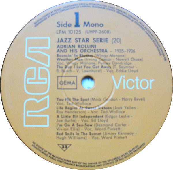 A1. Adrian And His Tap Room Gang - Bouncin' In Rhythm 2:43 A2. Adrian And His Tap Room Gang - Weather Man 3:18 A3. The Little Ramblers - The Day I Let You Get Away 2:42 A4. The Little Ramblers - You Hit The Spot 2:52 A5. The Little Ramblers - Life Begins At Sweet Sixteen 2:47 A6. The Little Ramblers - A Little Bit Independent 2:41 A7. The Little Ramblers - I'm On A See-Saw 3:08 A8. The Little Ramblers - Red Sails In The Sunset 2:41 B1. The Little Ramblers - The Music Goes 'Round 2:54 B2. The Little Ramblers - Truckin' 3:05 B3. The Little Ramblers - Streamlined Gretna Green 2:29 B4. The Little Ramblers - Loveless Love 2:45 B5. Adrian And His Tap Room Gang - I Got A Need For You 3:11 B6. Adrian And His Tap Room Gang - Nagasaki 2:23 B7. Adrian And His Tap Room Gang - Honeysuckle Rose 2:32 B8. Adrian And His Tap Room Gang - Jazz O' Jazz 2:55