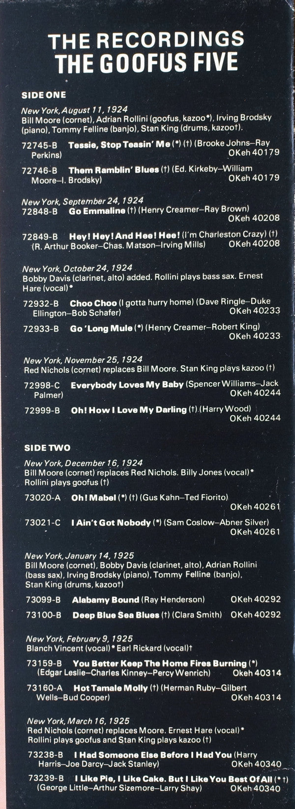 A1. Tessie, Stop Teasin' Me A2. Them Ramblin' Blues A3. Go Emmaline A4. Hey! Hey! And Hee! Hee! (I'm Charleston Crazy) A5. Choo Choo (I Gotta Hurry Home) A6. Go 'Long Mule A7. Everybody Loves My Baby A8. Oh! How I Love My Darling B1. Oh! Mabel B2. I Ain't Got Nobody To Love B3. Alabamy Bound B4. Deep Blue Sea Blues B5. You Better Keep The Home Fires Burning B6. Hot Tamale Molly B7. I Had Someone Else Before I Had You B8. I like Pie, I Like Cake, But I Like You Best Of All