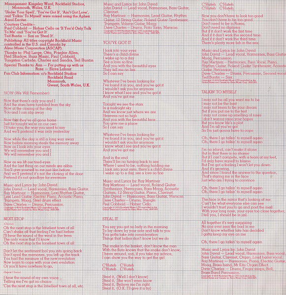 Track A1: label states title as "Now". Track B5: label states title as "You'd Only Talk To Me". Lyrics are printed on the inner liner.