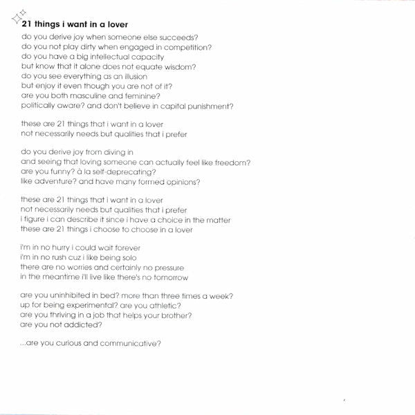 1. 21 Things I Want In A Lover 3:282. Narcissus 3:383. Hands Clean 4:314. Flinch 6:045. So Unsexy 5:096. Precious Illusions 4:117. That Particular Time 4:228. A Man 4:339. You Owe Me Nothing In Return 4:5810. Surrendering 4:3611. Utopia 4:58
