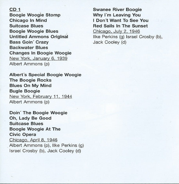 . Albert Ammons - Boogie Woogie Stomp 1-1. Boogie Woogie Stomp 3:361-2. Chicago In Mind 3:591-3. Suitcase Blues 3:501-4. Boogie Woogie Blues 3:411-5. Untitled Ammons Original 4:051-6. Bass Goin' Crazy 3:201-7. Backwater Blues 4:031-8. Changes In Boogie Woogie 4:051-9. Albert's Special Boogie Woogie 3:001-10. The Boogie Rocks 3:001-11. Blues On My Mind 3:071-12. Bugle Boogie 2:511-13. Doin' The Boogie Woogie 2:491-14. Oh, Lady Be Good 2:321-15. Suitcase Blues 2:441-16. Boogie Woogie At The Civic Opera 2:341-17. Swanee River Boogie 2:311-18. Why I'm Leaving You 2:391-19. I Don't Want To See You 2:501-20. Red Sails In The Sunset 2:29. Meade "Lux" Lewis - Lux's Boogie 2-1. Honky Tonk Train Blues 4:132-2. Bass On Top 3:402-3. Six Wheel Chaser 3:542-4. Tell Your Story 4:002-5. Tell Your Story N° 2 4:102-6. Rising Tide Blues 3:412-7. Doll House Boogie 4:082-8. Denapas Parade 3:002-9. The Boogie Tidal 2:312-10. Randini's Boogie 2:132-11. Lux's Boogie 2:172-12. Yancey's Pride 2:282-13. Glendale Glide 2:102-14. Yancey Special 4:102-15. Blues Whistle 4:182-16. Chicago Flyer 3:59