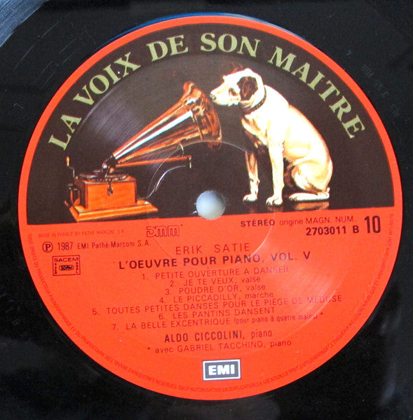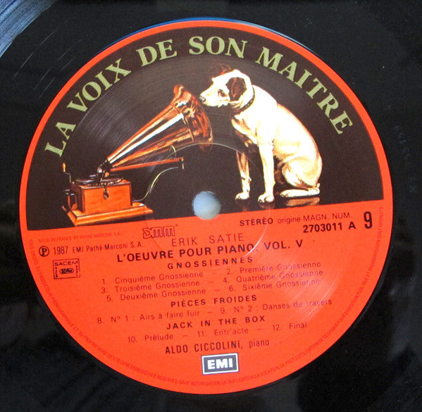 A1. Cinquième Gnossienne (1889) 3:29 A2. Première Gnossienne (1890?) 2:59 A3. Troisième Gnossienne (1890) 2:17 A4. Quatrième Gnossienne (1891) A5. Deuxième Gnossienne (1893) 1:23 A6. Sixième Gnossienne (1897) 1:10 A7. Airs A Fuir I II III (1897) 6:29 A8. Danses De Travers I II III (1897) 3:49 A9. Jack In The Box (1899) - Prélude 2:17 A10. - Entr'acte 1:58 A11. - Final 2:14 B1. Petite Ouverture & Danser (1900) 1:18 B2. Je Te Veux (1897-1904) 5:45 B3. Poudre D'Or (1902) 5:18 B4. Le "Piccadilly" (1904-1907) 1:30 B5. Toutes Petites Danses Pour "Le Piège De Méduse" (1913) 3:24 B6. Les Pantins Dansent (1913) 1:38 B7. La Belle Excentrique, Fantaisiz Sérieuse (A Quatre Mains) (1920) 7:31
