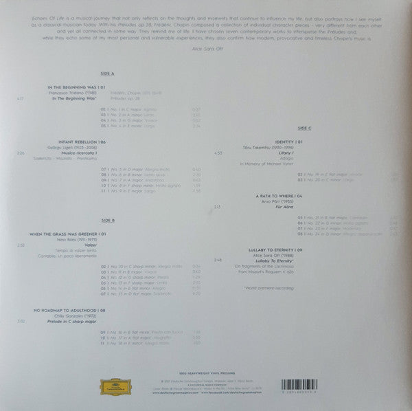 A1. In The Beginning Was 4:17 . Préludes Op. 28 . Infant Rebellion A6. Musica Ricercata I (Sostenuto - Misurato - Prestissimo) 2:26 . Préludes Op. 28 . When The Grass Was Greener B1. Valzer (Tempo Di Valzer Lento. Cantabile, Un Poco Liberamente) 2:52 . Préludes Op. 28 . No Roadmap To Adulthood B8. Prelude In C Sharp Major 3:02 . Préludes Op. 28 . Identity C1. Litany I (Adagio) (In Memory Of Michael Vyner) 4:53 . Préludes Op. 28 . A Path To Where C4. Für Alina 2:13 . Préludes Op. 28 . Lullaby To Eternity C9. Lullaby To Eternity (On Fragments Of The Lacrimosa From Mozart's Requiem K 626) 2:48