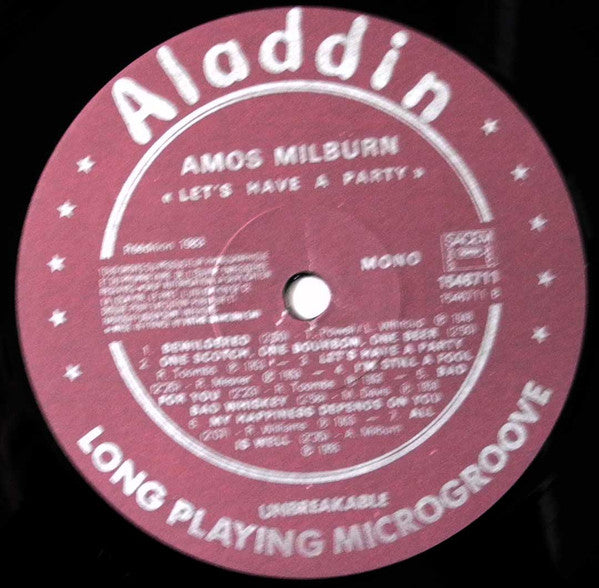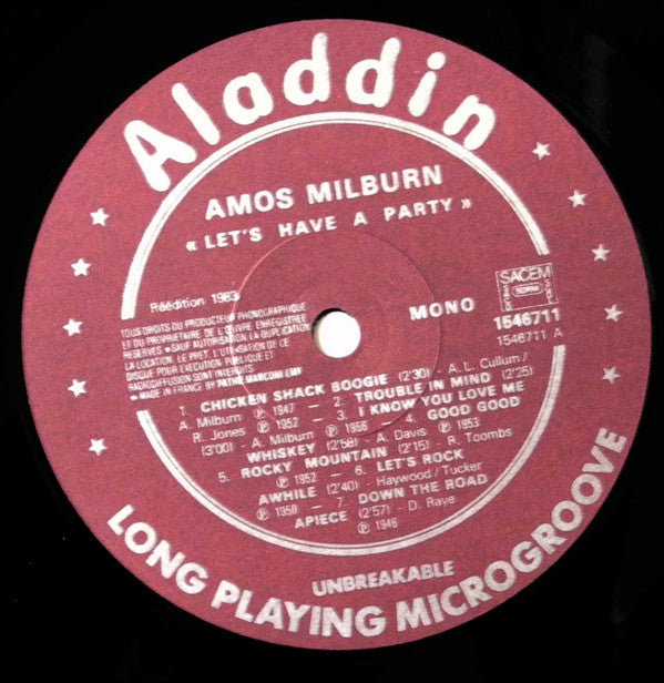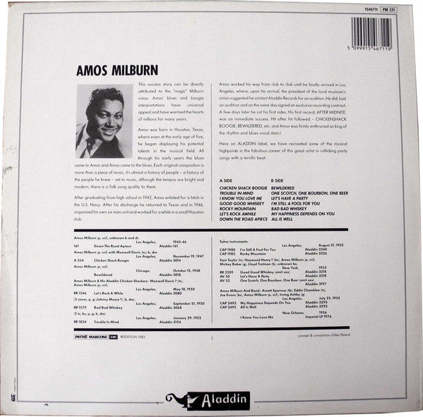 A1. Amos Milburn, Maxwell Davis - Chicken Shack Boogie 2:30 A2. Amos Milburn And His Aladdin Chickenshackers - Trouble In Mind 2:25 A3. Amos Milburn & His Band - I Know You Love Me 3:00 A4. Amos Milburn And His Aladdin Chickenshackers - Good Good Whiskey 2:58 A5. Amos Milburn And His Aladdin Chickenshackers - Rocky Mountain 2:15 A6. Amos Milburn And His Aladdin Chickenshackers - Let's Rock Awhile 2:40 A7. Amos Milburn - Down The Road Apiece 2:57 B1. Amos Milburn - Bewildered 2:50 B2. Amos Milburn And His Aladdin Chickenshackers - One Scotch, One Bourbon, One Beer 2:50 B3. Amos Milburn And His Aladdin Chickenshackers - Let's Have A Party 2:25 B4. Amos Milburn And His Aladdin Chickenshackers - I'm Still A Fool For You 2:23 B5. Amos Milburn And His Aladdin Chickenshackers - Bad Bad Whiskey 2:58 B6. Amos Milburn & His Band - My Happiness Depends On You 2:07 B7. Amos Milburn & His Band - All Is Well 2:35
