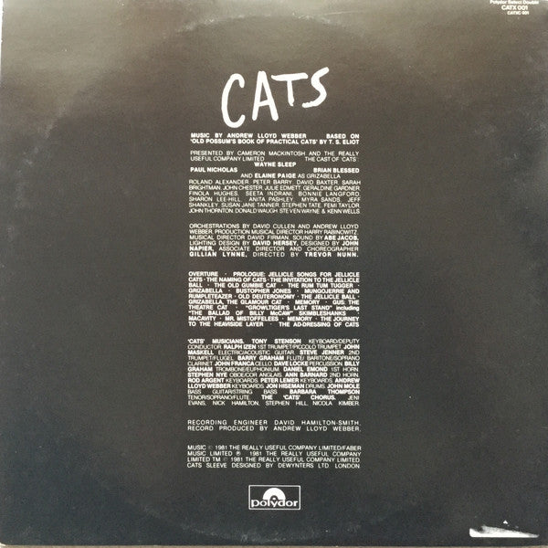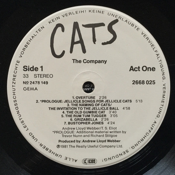 A1. Overture A2. Prologue: Jellicle Songs For Jellicle Cats A3. The Naming Of Cats A4. The Invitation To The Jellicle Ball A5. The Old Gumbie Cat A6. The Rum Tum Tugger A7. Grizabella A8. Bustopher Jones B1. Mungojerrie And Rumpelteazer B2. Old Deuteronomy B3. The Jellicle Ball B4. Grizabella, The Glamour Cat B5. Memory C1. The Moments Of Happiness C2. Gus: The Theatre Cat C3. "Growltiger's Last Stand" Including "The Ballad Of Billy McCaw" C4. Skimbleshanks D1. Macavity D2. Mr. Mistoffolees D3. Memory D4. The Journey To The Heaviside Layer D5. The Ad-Dressing Of Cats
