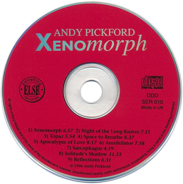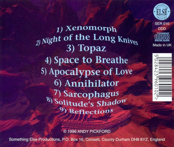 Note: cd's ordered directly from Andy Pickford included a card with the following note "Please note the running order of this CD is not the same as designated on the sleeve and label. Track 4 is Apocalypse Of Love and Track 5 is Space To Breathe."