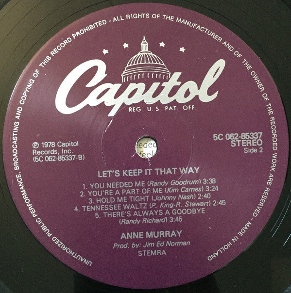 A1. Let's Keep It That Way 3:34 A2. Walk Right Back 2:38 A3. Just To Feel This Love From You 3:05 A4. We Don't Make Love Anymore 3:49 A5. I Still Wish The Very Best For You 3:10 B1. You Needed Me 3:38 B2. You're A Part Of Me 3:24 B3. Hold Me Tight 2:40 B4. Tennessee Waltz 2:45 B5. There's Always A Goodbye 3:45