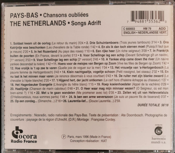 1. Soldaat Kwam Uit De Oorlog = Le Retour Du Marin = Soldier Returned From The War 3:242. Drie Schuintamboers = Trois Jeunes Tambours = Three Side-Drummers 3:143. Ons Katrijntje Was Beschonken = Les Chevaliers De La Table Ronde = Our Catherine Was Drunk 1:424. En Als Ik Dan Toch Sterven Moet = Puisqu'il Faut Que Je Meure = And If Still I Must Die 2:205. In Het Rozenland = Au Pays Des Roses = In Oostland 1:106. Een Rijke Heer = Un Riche Seigneur = A Wealthy Gentleman 3:097. In Frankrijk Buiten De Poorten = En France, Devant La Porte = In France Outside The Gates 5:138. Voor Schellinge Lag Een Schip = Devant Schellinge Gît Un Navire = Off Schellinge Was A Ship 3:539. Voor Schellinge Lag Een Schip = Devant Schellinge Gît Un Navire = Off Schellinge Was A Ship 3:4510. A Yankee Ship Came Down The River = Un Navire Yankee Descendait La Rivière = A Yankee Ship Came Down The River 1:4211. Hoera Voor De Meisjes Van Bergen Op Zoom = Vive Les Filles De Bergen Op Zoom = Bergen Op Zoom 1:4212. Hoe Vrolijk Is 'T Op Zee Te Varen = Quelle Joie De Voguer Sur La Mer = How Cheery 'Tis To Sail The Sea 1:0413. Het Vrouwtje Van 'S-Hertogenbosch = La Pauvre Femme De Hertogenbosch = A Woman From Hertogenbosch Once Came 3:4314. Klein Nachtgaaltje Vogeltje Schoon = Petit Rossignol, Bel Oiseau = Small Nightengale, Beautiful Bird 2:3215. En Nu Laat Ik Het Minnen Maar Varen = Je Renounce Désormais À Vous Courtiser = And Now I'll Give Up Counting 0:4316. De Ruiter Met Zijn Blanke Zwaard = Le Chevalier À L'épée Blanche = The Knight With A White Sword 2:2017. 'T Hijgend Hert Der Jacht Ontkomen = Le Cerf Hors D'haleine Échappe Au Chasseur = The Panting Deer, Escaped From The Hunter 1:2718. Het Hagenbeuker Evangelie = L'évangile Du Hêtre Blanc = The Hornbeam Gospel 1:1519. Roep Koeienhoedster = Appel De La Vachère = Call Of The Cowherderess 0:2920. Haallijntje = Chanson De Marin Caboteur = Shanty 0:4821. O Heer Waar Mag Mijn Minnaar Wezen = Ô Seigneur, Où Est Mon Bien-aimé ? = Oh Lord, Where Could My Lover Be? 1:1622. Met U Te Gaan Wandelen = Me Promener Avec Toi = To Go Walking With You 0:3523. Zeilen Wij Uit Van Hellevoetsluis = D'Hellevoetsluis, Nous Sommes Partis = We Set Out From Hellevoetsluis 1:4824. Ik Ben Een Arme Weverszoon = Je Suis Un Pauvre Fils De Tisserand = I Am A Poor Weaver's Son 0:3725. Op Een Zondag... = Dimanche... = One Sunday... 2:1826. Laurentia-Lief... = Douce Laurentia... Laurentia Sweet... 2:59