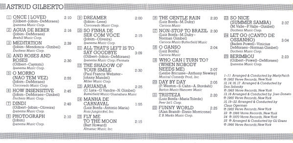 1. Once I Loved 2:102. Agua De Beber 2:163. Meditation 2:394. And Roses And Roses 2:305. O Moro (Nao Tem Vez) 2:556. How Insensitive 2:457. Dindi 2:408. Photograph 2:109. Dreamer 2:0010. So Finha De Ser Com Voce 2:1511. All That's Left Is To Say Goodbye 3:0912. The Shadow Of Your Smile 2:3013. Aruanda 2:2514. Manha De Carnaval 1:5515. Fly Me To The Moon 2:1516. The Gentle Rain 2:2017. Non-stop To Brazil 2:3018. O Ganso 2:0419. Who Can I Turn To? (When Nobody Needs Me) 2:0720. Day By Day 2:0521. Tristeza 2:2022. Funny World 2:2523. So Nice (Summer Samba) 2:3724. Let Go (Canto De Ossanho) 3:0425. Berimbou 2:23