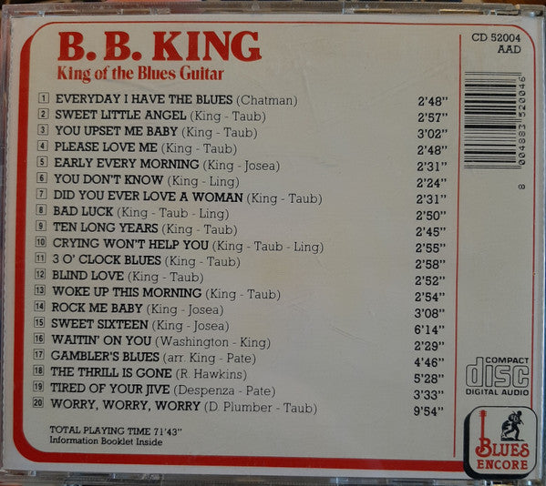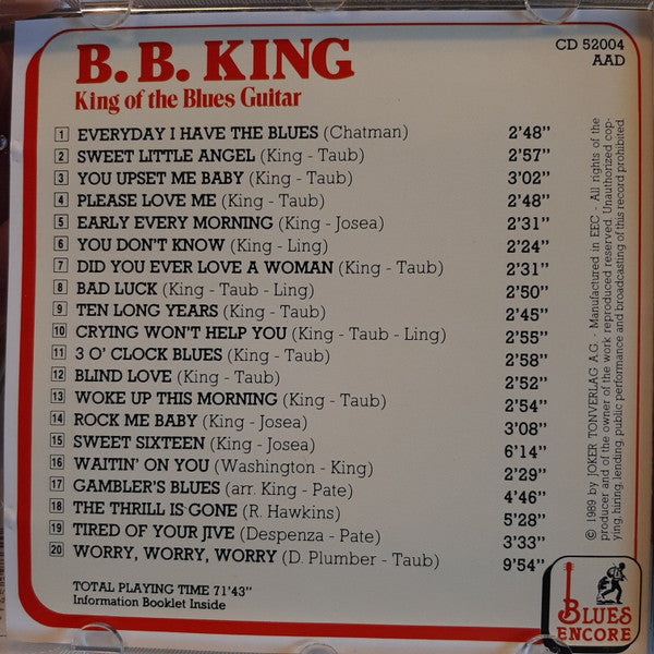 1. Everyday I Have The Blues 2:482. Sweet Little Angel 2:573. You Upset Me Baby 3:024. Please Love Me 2:485. Early Every Morning 2:316. You Don't Know 2:247. Did You Ever Love A Woman 2:318. Bad Luck 2:509. Ten Long Years 2:4510. Crying Won't Help You 2:5511. 3 O' Clock Blues 2:5812. Blind Love 2:5213. Woke Up This Morning 2:5414. Rock Me Baby 3:0815. Sweet Sixteen 6:1416. Waitin' On You 2:2917. Gambler's Blues 4:4618. The Thrill Is Gone 5:2819. Tired Of Your Jive 3:3320. Worry, Worry, Worry 9:54