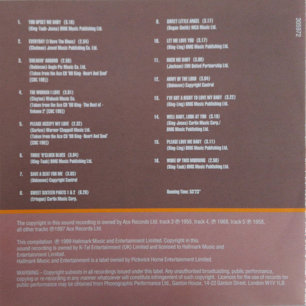 1. You Upset Me Baby 3:182. Everyday (I Have The Blues) 2:543. Sneakin' Around 2:594. The Woman I Love 3:015. Please Accept My Love 2:326. Three 'O'Clock Blues 3:047. Save A Seat For Me 3:038. Sweet Sixteen Parts 1 & 2 6:289. Sweet Little Angel 3:1710. Let Me Love You 3:1711. Rock Me Baby 3:0912. Army Of The Lord 3:0413. I've Got A Right To Love My Baby 3:2214. Well Baby, Look At You 3:1915. Please Love Me Baby 3:1116. Woke Up This Morning 2:58
