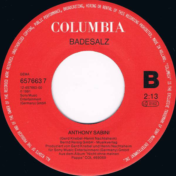 © 1991 Sony Music Entertainment (Germany) GmbH ℗ 1991 Sony Music Entertainment (Germany) GmbH Distribution Sony Music Made in Holland Aus dem Album "Nicht Ohne Meinen Pappa" COL 469069 A: Blue Mountain Music, Ltd. B: Bernd Reisig GmbH - Musikverlag