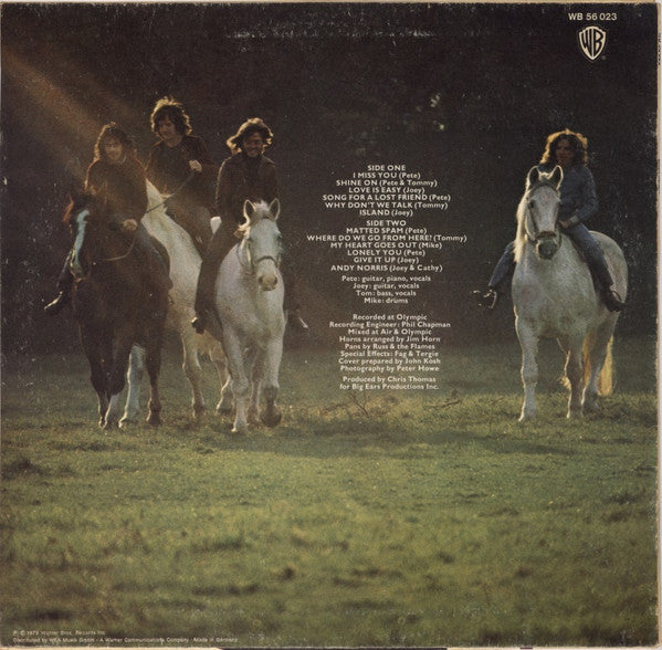 A1. I Miss You 2:35 A2. Shine On 2:52 A3. Love Is Easy 3:08 A4. Song For A Lost Friend 2:52 A5. Why Don't We Talk 3:45 A6. Island 3:40 B1. Matted Spam 3:09 B2. Where Do We Go From Here? 3:24 B3. My Heart Goes Out 2:16 B4. Lonely You 3:47 B5. Give It Up 4:34 B6. Andy Norris 2:59