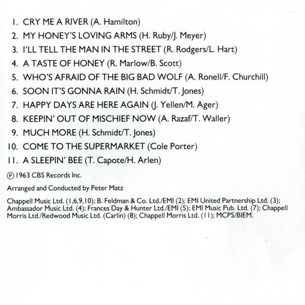 1. Cry Me A River 3:412. My Honey's Loving Arms 2:173. I'll Tell The Man In The Street 3:124. A Taste Of Honey 2:535. Who's Afraid Of The Big Bad Wolf 2:326. Soon It's Gonna Rain 3:457. Happy Days Are Here Again 3:078. Keepin' Out Of Mischief Now 2:149. Much More 3:0410. Come To The Supermarket 2:0011. A Sleepin' Bee 4:23
