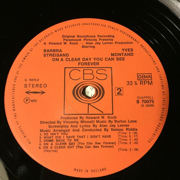 A1. Barbra Streisand - Hurry! It's Lovely Up Here 2:55 A2. On A Clear Day You Can See Forever Orchestra And Chorus - Main Title—On A Clear Day 2:44 A3. Barbra Streisand - Love With All The Trimmings 3:02 A4. Yves Montand - Melinda 2:30 A5. Barbra Streisand - Go To Sleep 2:24 B1. Barbra Streisand - He Isn't You 2:28 B2. Barbra Streisand - What Did I Have That I Don't Have 6:17 B3. Yves Montand - Come Back To Me 4:48 B4. Yves Montand - On A Clear Day 2:49 B5. Barbra Streisand - On A Clear Day 2:08