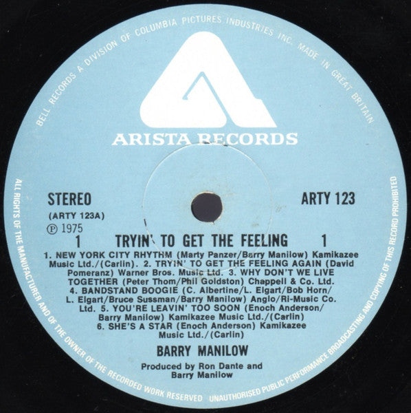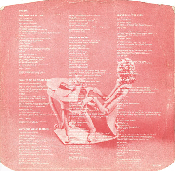 A1. New York City Rhythm A2. Tryin' To Get The Feeling Again A3. Why Don't We Live Together A4. Bandstand Boogie A5. You're Leaving Too Soon A6. She's A Star B1. I Write The Songs B2. As Sure As I'm Standing Here B3. A Nice Boy Like Me B4. Lay Me Down B5. Beautiful Music