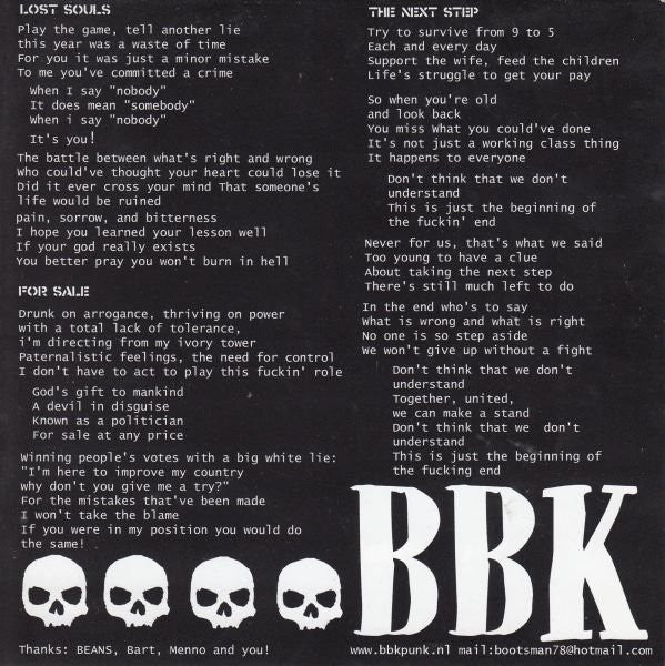 A1. Beans (4) - Pull Through A2. Beans (4) - Blackmind A3. Beans (4) - Hey Kid B1. BBK - Lost Souls B2. BBK - For Sale B3. BBK - The Next Step
